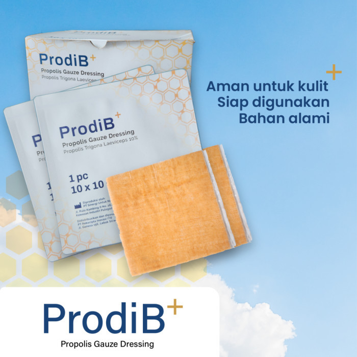 ProdiB+ Propolis Gauze Untuk penyembuhan luka luar yang mengandung propolis dari lebah tanpa sengat asli Indonesia. Kasa ini merupakan kasa siap pakai yang memberikan hasil positif untuk luka diabetes, luka bakar, dan cedera.